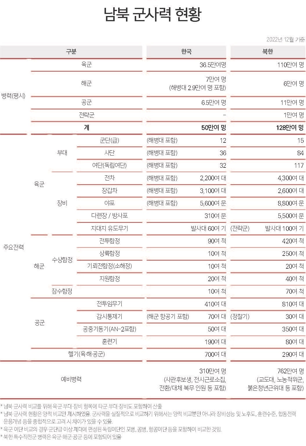국방부가 발간한 2022년 국방백서에 따르면 남북 무기 보유량은 아래 표와 같다.